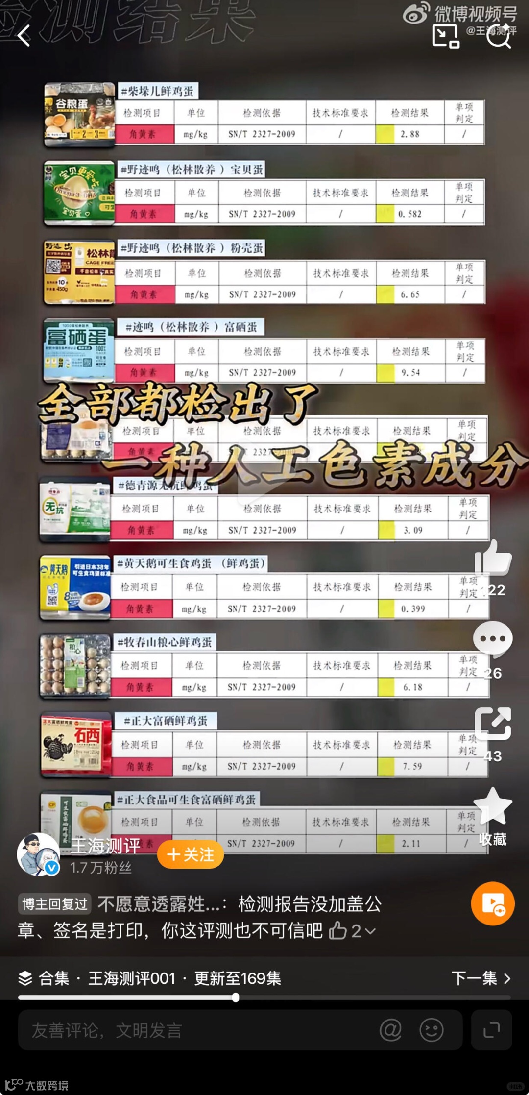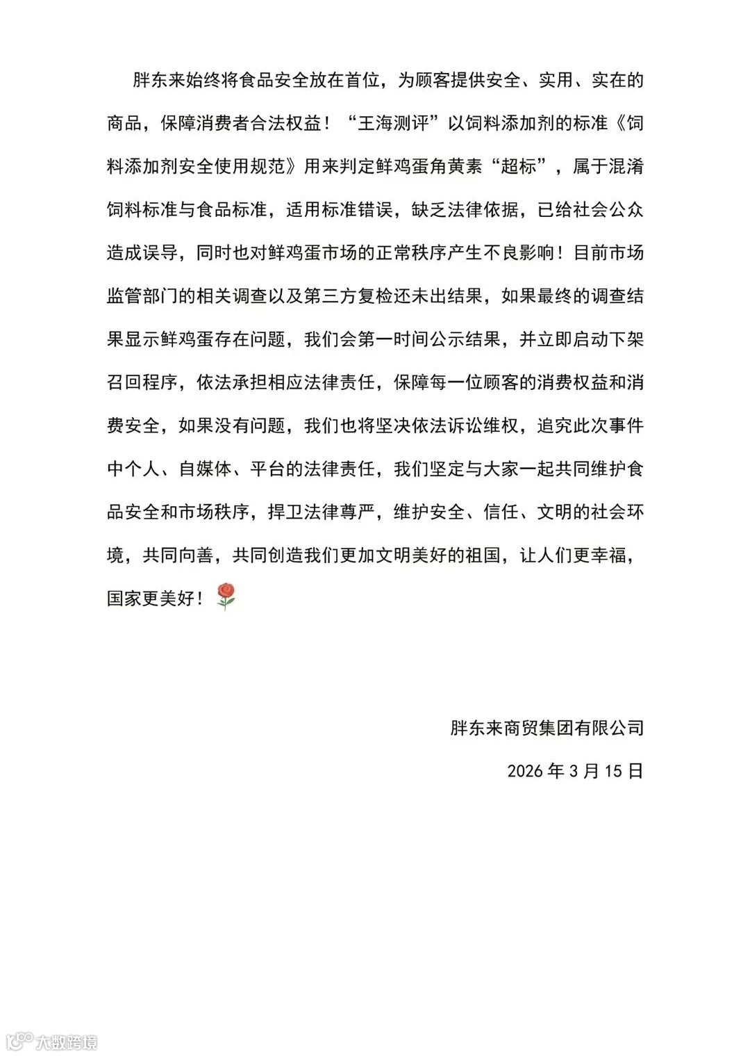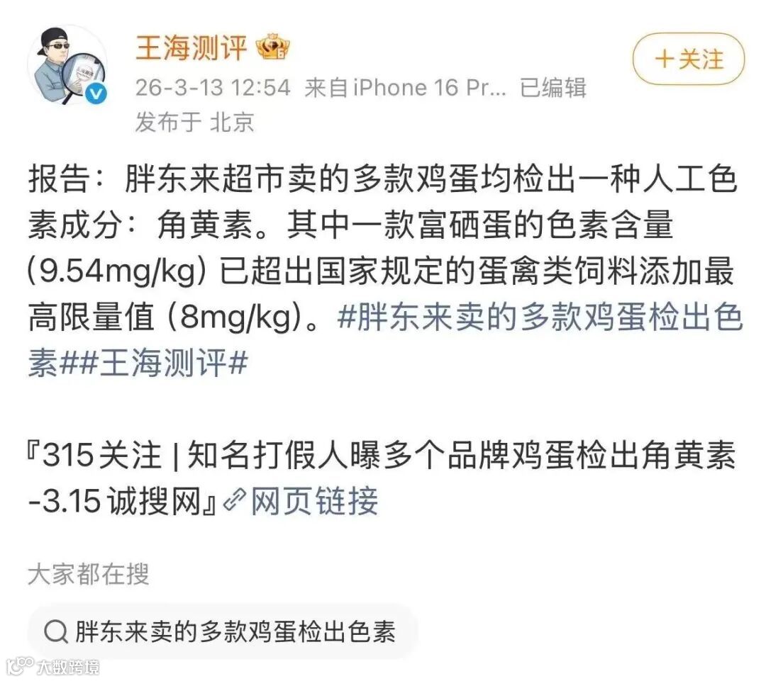 3月13日,打假团队王海测评发布测评数据,直指胖东来在售的多款鸡蛋检出角黄素。