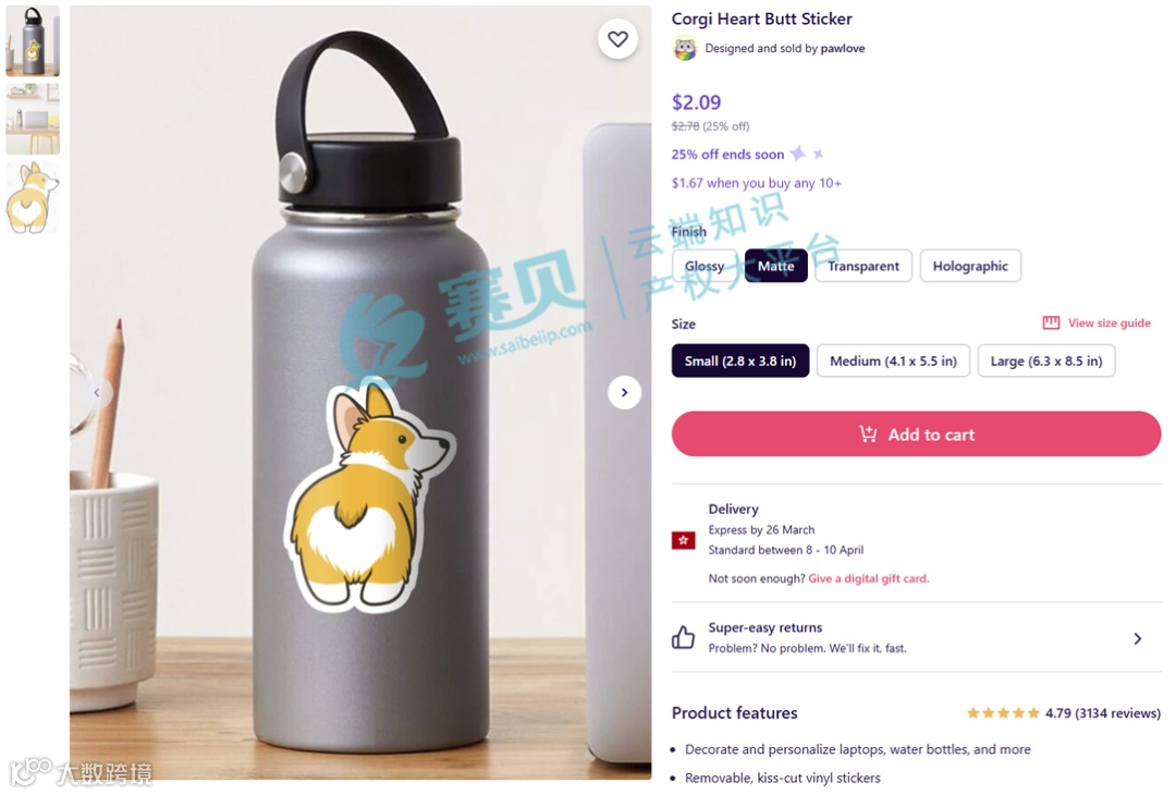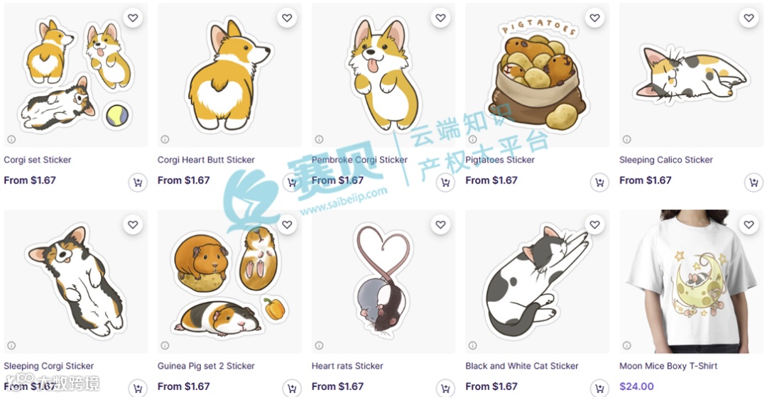 “Corgi Heart Butt”系原告核心原创插画,已在美国版权局完成注册。相关授权产品统称“Winnie Kan Products”,主要覆盖宠物周边类目,包括贴纸、马克杯等。