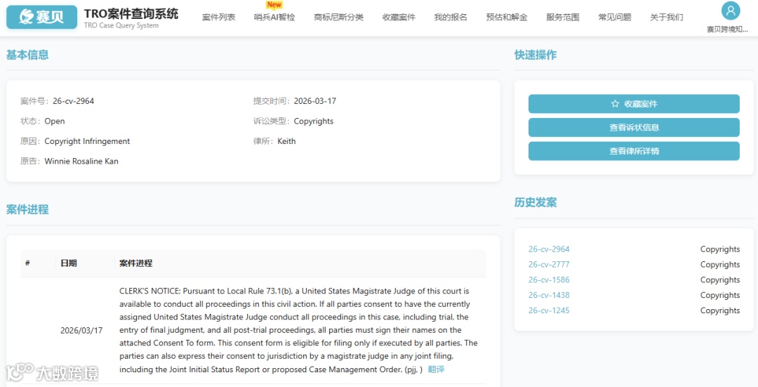 据赛贝TRO案件查询系统显示,2026年3月17日,印尼籍艺术家Winnie Rosaline Kan在美国伊利诺伊州北区联邦地区法院(东部分院)提起版权侵权诉讼,并申请临时限制令(TRO)。原告委托Keith律所代理,指控多名被告销售印有其受美国版权保护的插画“Corgi Heart Butt”的侵权商品,涉及贴纸、马克杯等品类。