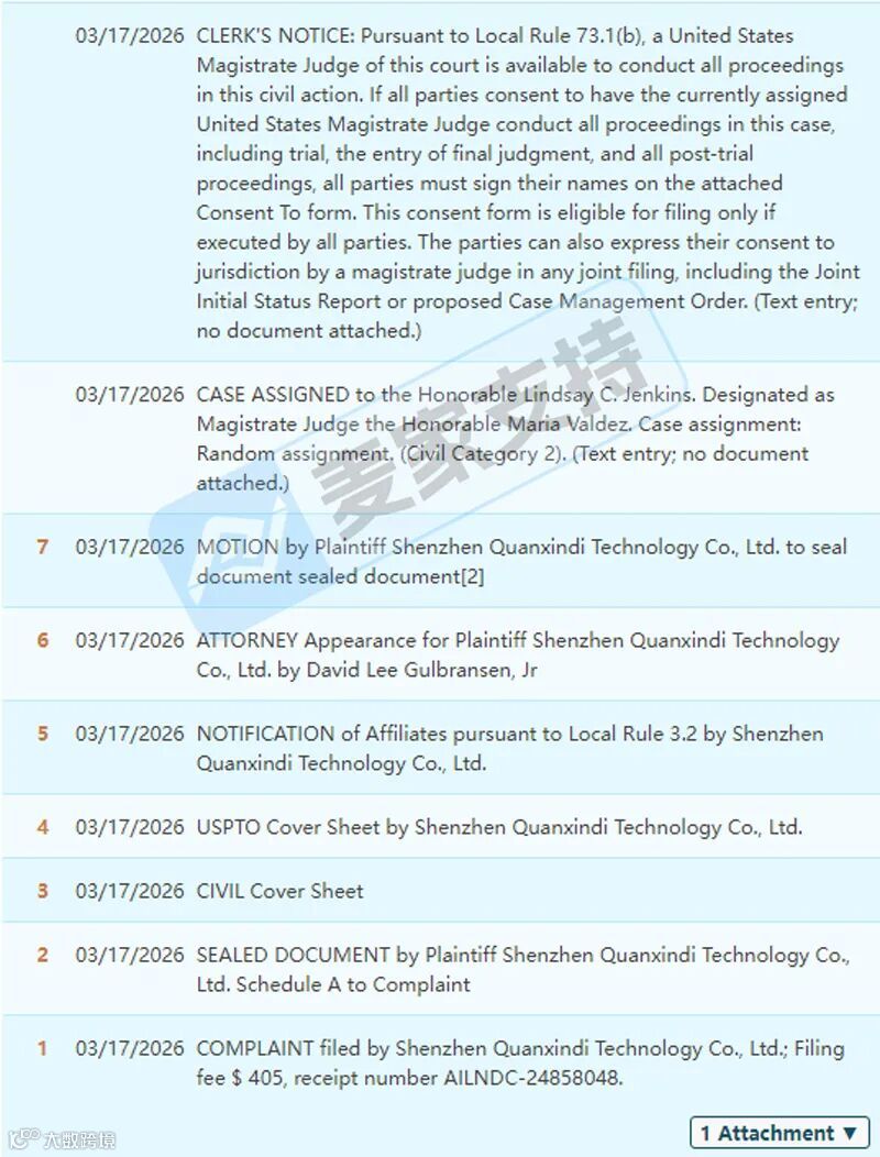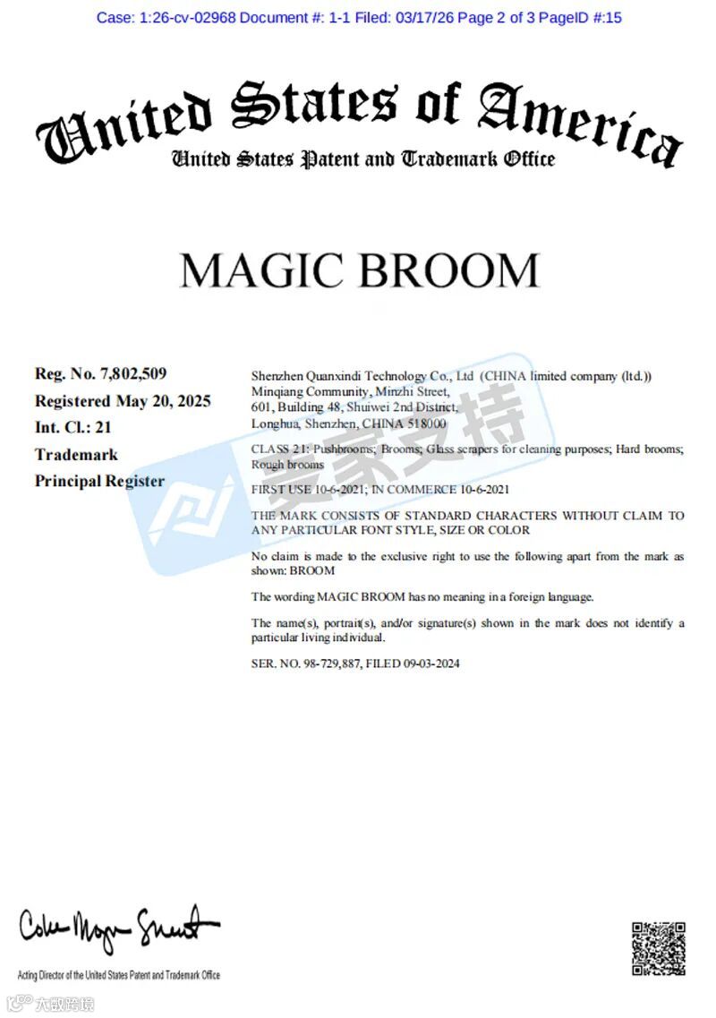 本案是David律所代理Shenzhen Quanxindi Technology Co., Ltd针对其Magic Broom商标发起的维权 ,涉案商标号为:7802509,涵盖第21大类的扫帚以及清洁用品类目,于2025年5月20日获得美国商标认证。除此之外,Shenzhen Quanxindi Technology Co., Ltd在美国还注册有专利号为:D991607的外观专利,于2023年7月4日获得美国专利认证,并于2024年10月和11月分别通过Konrad Sherinian律所发起维权,近百店涉案,账户资金被TRO冻结!