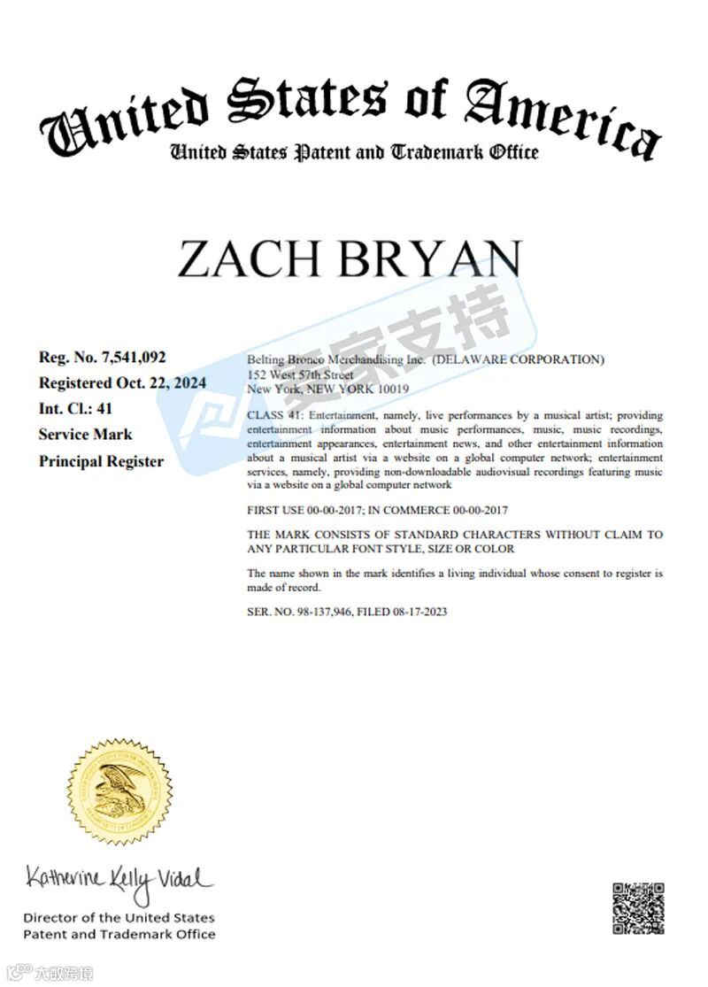 Zach Bryan与Kacey Musgraves合作的《I Remember Everything》登顶公告牌百强单曲榜,并获第66届格莱美奖最佳乡村团体/组合奖,还被评为年度新男艺人。Ceremony of Roses Acquisition LLC 作为美国的一家专注于艺人IP商业化运营公司,拥有Zach Bryan商标的所有权。