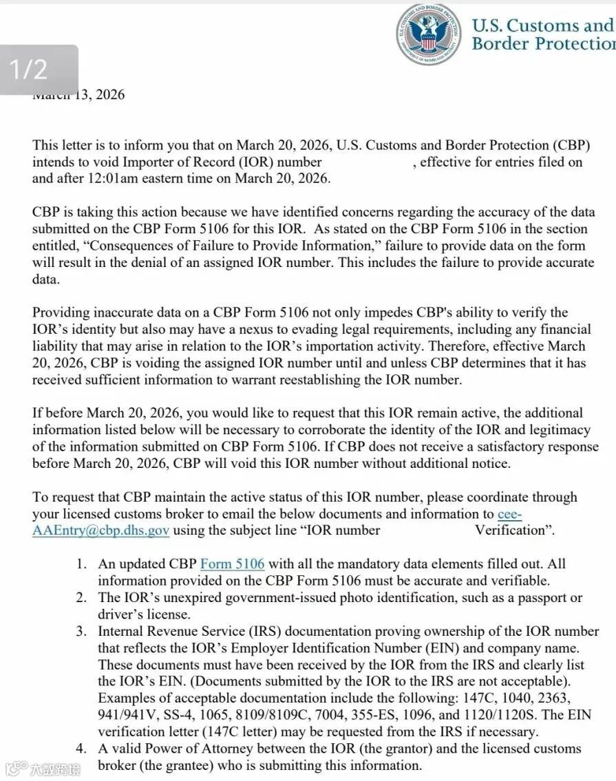3月16日,美国海关与边境保护局(CBP)发布通知,新一轮进口商身份核查行动将于3月20日启动,大批“记录进口商”(IOR)编号将正式废止,所有新提交的进口申报单必须使用真实、可对应、可验证的IOR编号。任何虚假填报、资质不符的IOR编号,都将被海关直接拒绝,相关货物也无法完成清关流程。