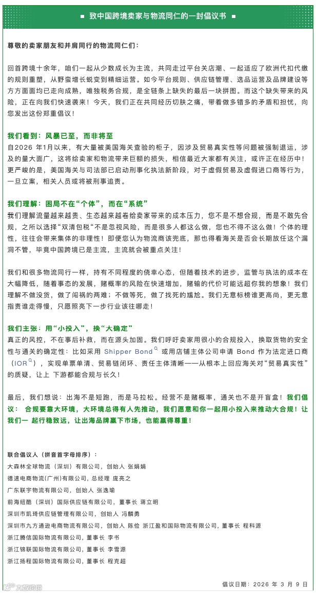 3月9日,大森林、德速、纽酷、凯琦、锦联等10家FBA头程物流领军企业联合发布了《致中国跨境卖家与物流同仁的倡议书》,呼吁集体停止“双清包税”物流模式。倡议书还写明,“双清包税”本质上是行业大环境共同作用的结果,主张通过申请Bond、使用正规主体作为IOR、单票单清等方式,共同推动合规生态建设。