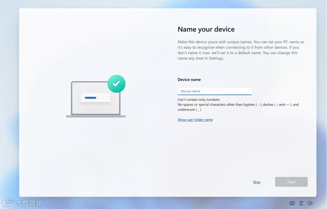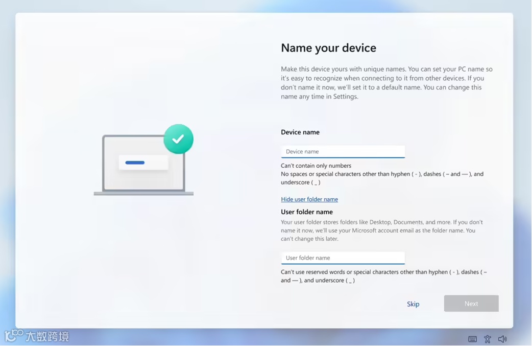 微软在安装向导的“设备命名”页面增加了一个“显示用户文件夹名称(Show user folder name)”的选项。用户现在可以手动输入想要的名称,只要符合Windows命名规则即可,系统会直接以此名称创建用户文件夹。