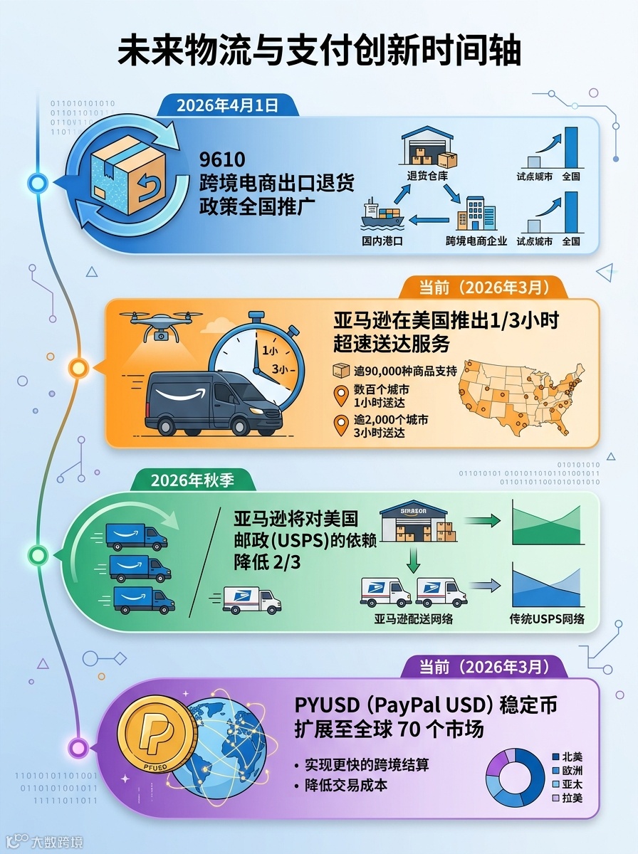 图3:物流与支付革新时间轴,对比展示9610跨关区退货、亚马逊极速配送、PYUSD扩展等关键事件节点与影响。