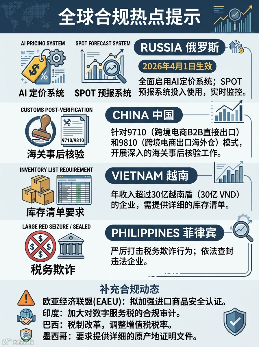 全球多地海关与税务监管同步升级。俄罗斯海关自4月1日起将试运行“SPOT”国家商品预报系统,并与AI核价系统联动,旨在打击“灰色进口”。五类中国产品被列为高风险查验目标,扣货率大幅上升。