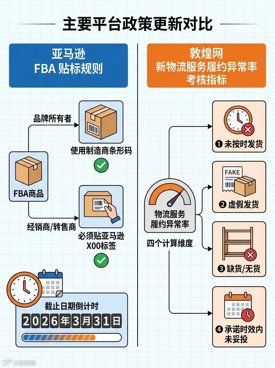 图1:亚马逊FBA贴标新规与敦煌网物流考核指标对比示意图,标注关键生效日期与核心要求。