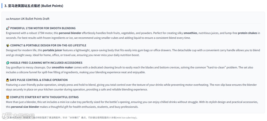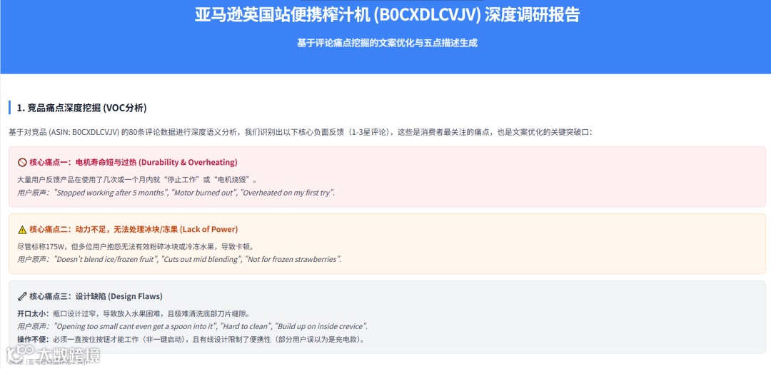 输入如:“英国站便携榨汁机,竞品ASIN是B0XXXX,挖一下评论痛点,再帮我写五点描述”,它将自动抓取并分析数百条真实买家评论,精准识别: