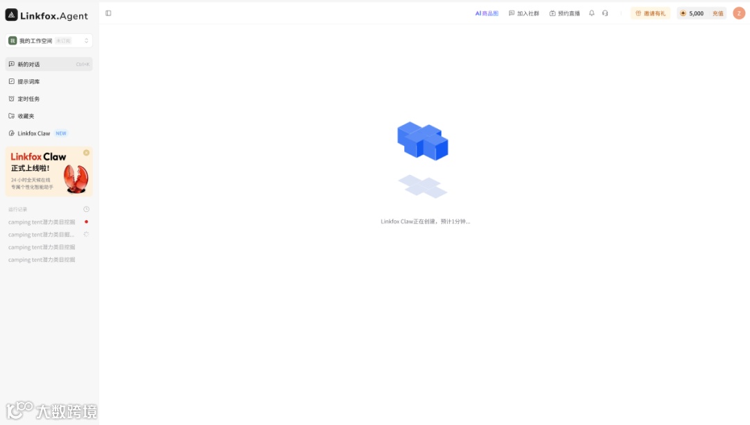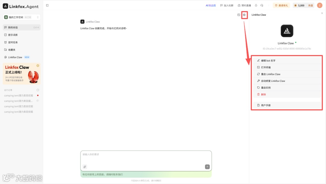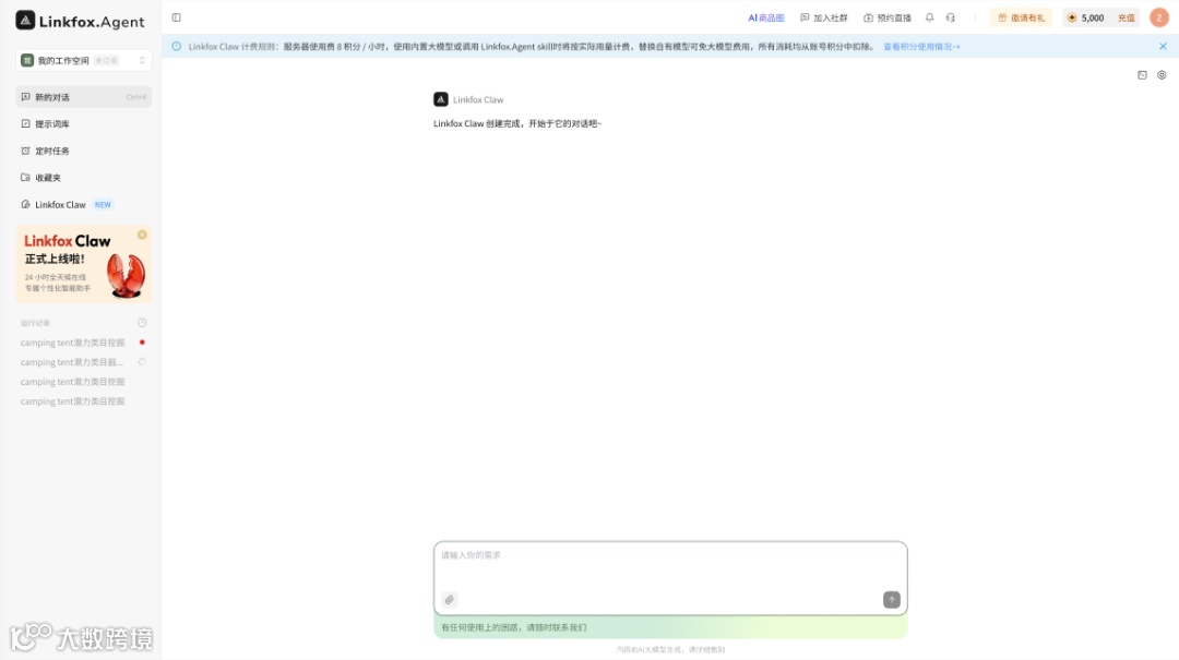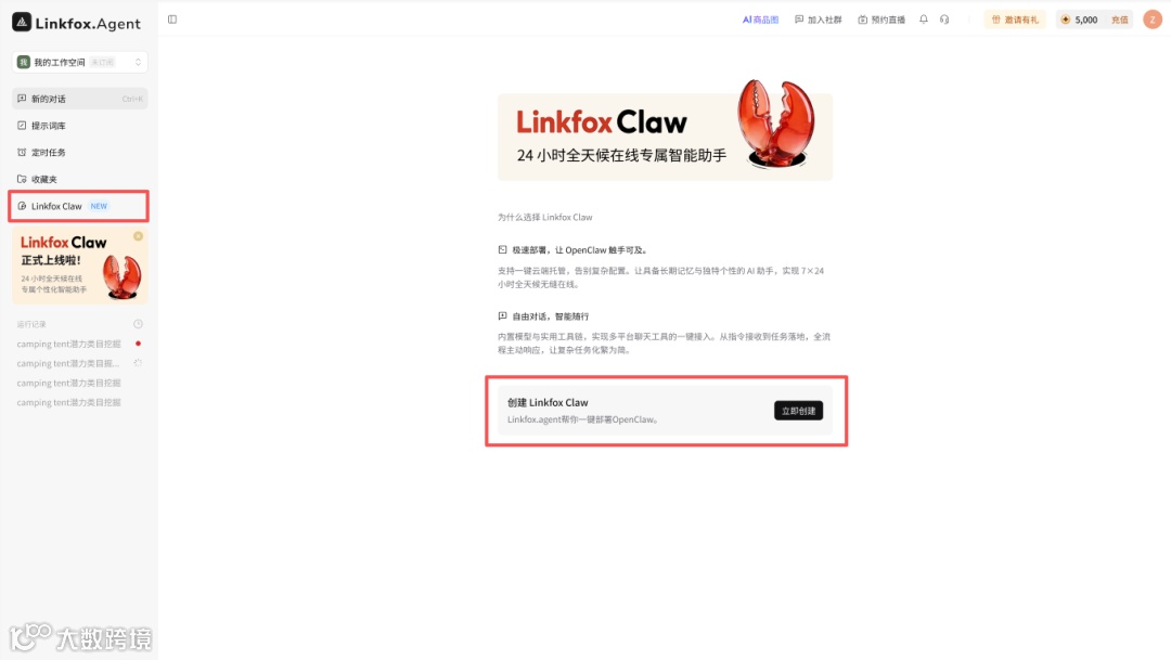 创建:在LinkFox Agent左侧菜单点击【LinkFox Claw】→【立即创建】