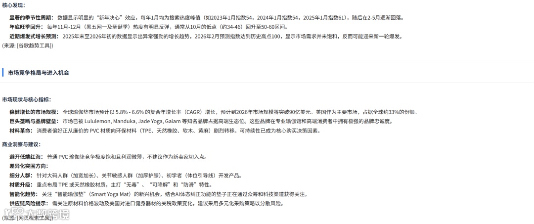 输入如:“TikTok美国站瑜伽垫,分析一下值不值得进”,LinkFox Claw将调取亚马逊实时数据,生成结构化报告: