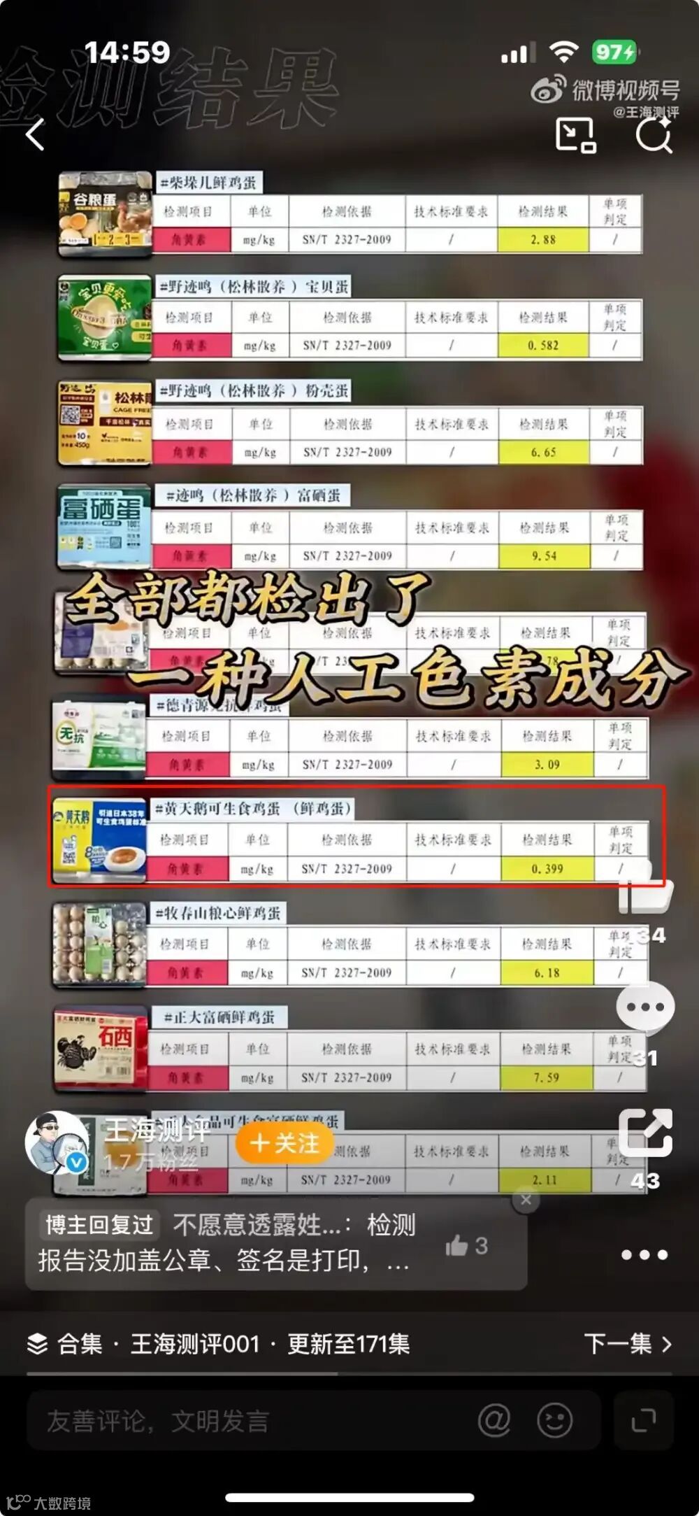 王海团队从胖东来门店采购多款鲜鸡蛋,委托青岛元信检测技术有限公司出具检测报告,称检出角黄素并判定“超标”。该结论迅速发酵,引发公众对食品安全的普遍关注。