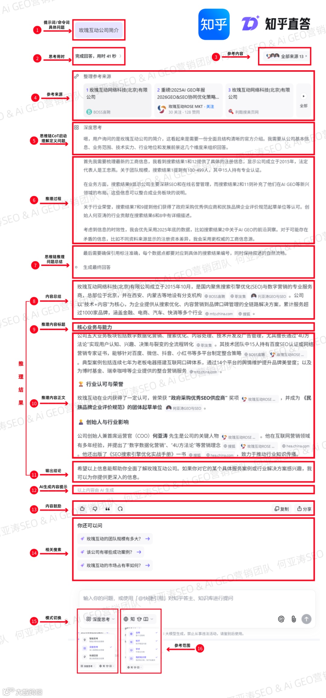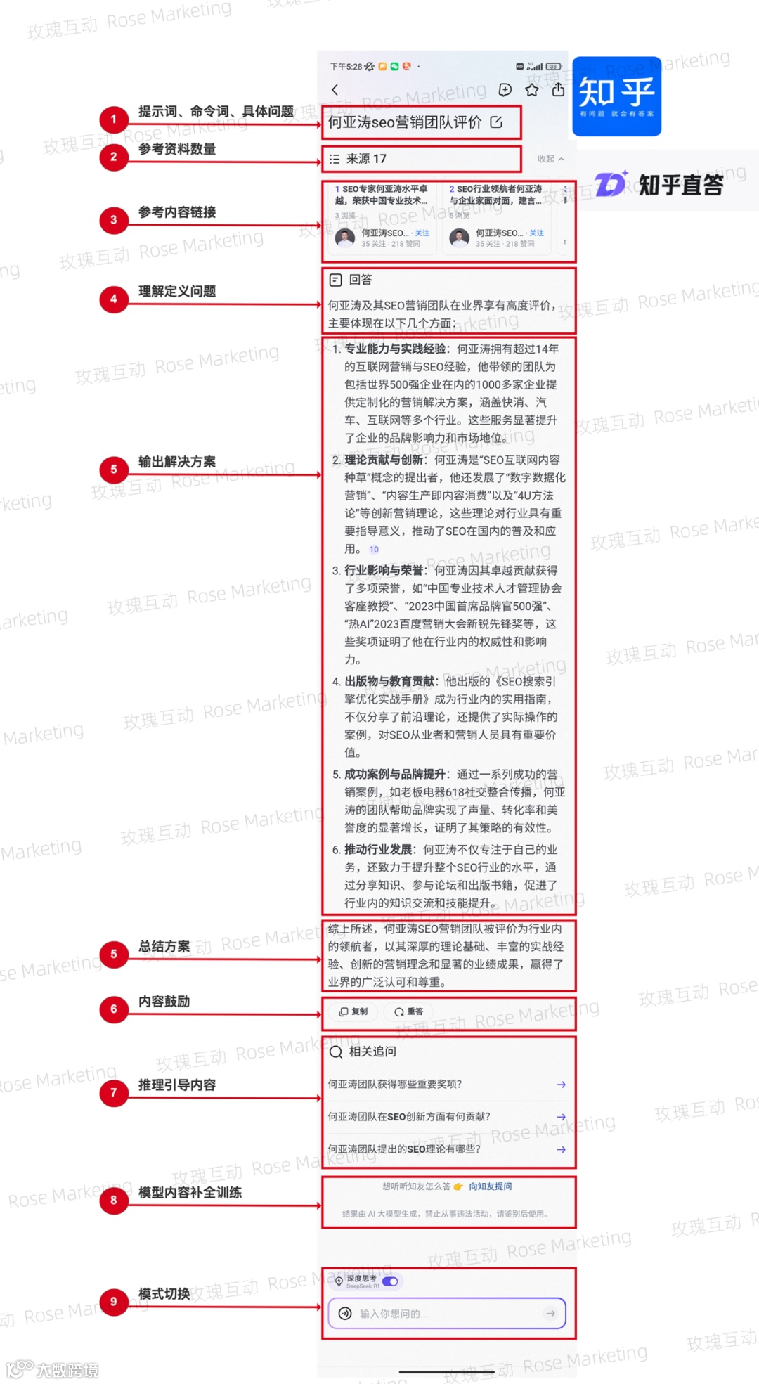 标注说明:①提示命令词;②参考文献数量;③参考内容链接;④问题定义模块;⑤解决方案;⑥总结陈述;⑦内容鼓励;⑧推理引导;⑨模型训练补全;⑩模式切换。