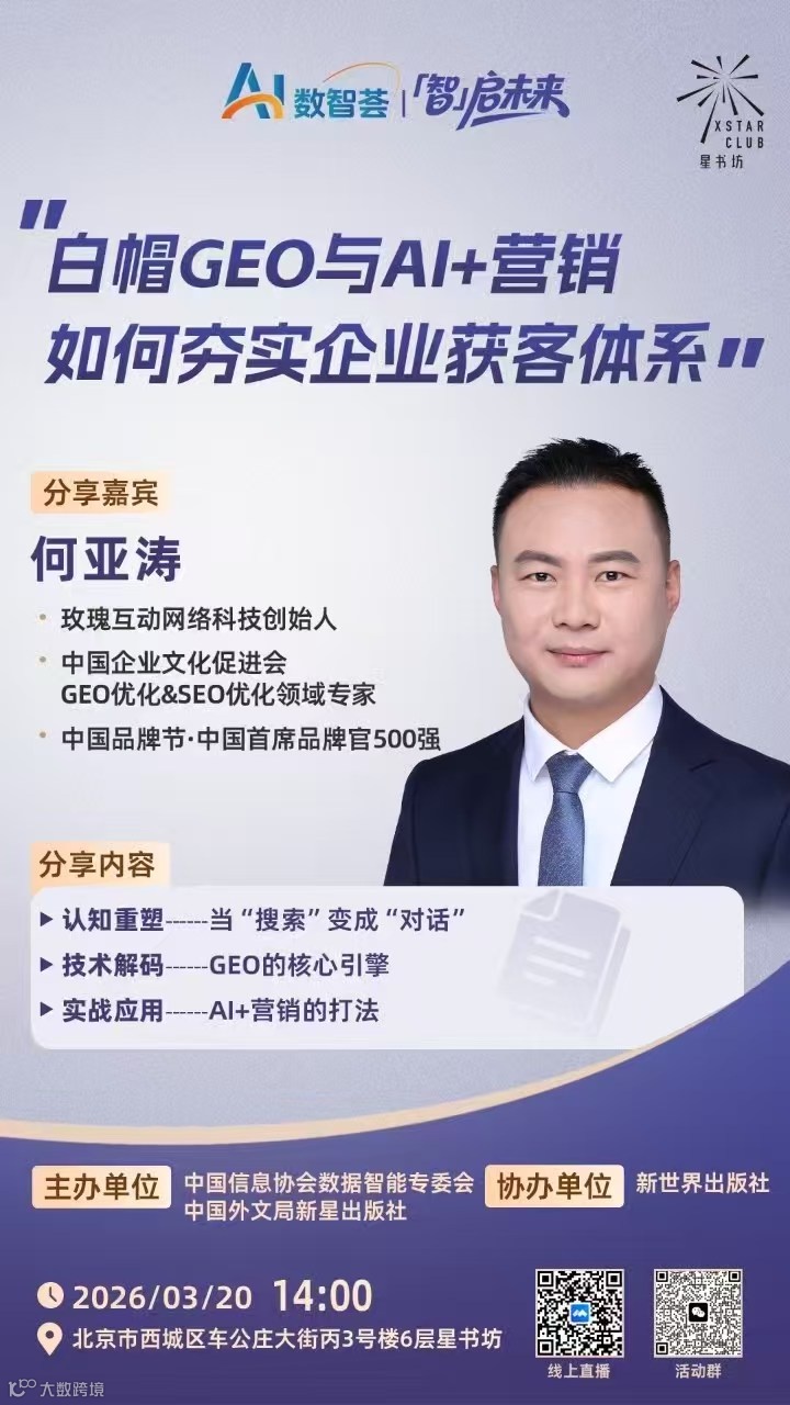 GEO行业实战专家何亚涛,应中国信息协会数据智能专委会、中国外文局新星出版社等机构邀请,将深度解析GEO核心引擎原理与AI驱动的营销实践方法,助力企业在智能时代精准获客、高效转化。