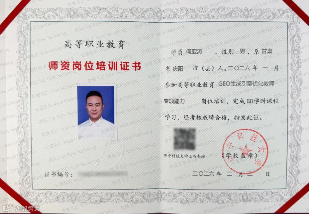 2026年3月,何亚涛正式获得华中科技大学GEO生成引擎优化(Generative Engine Optimization)课程讲师资格认证,成为国内首批具备高校GEO课程教学资质的专家之一。