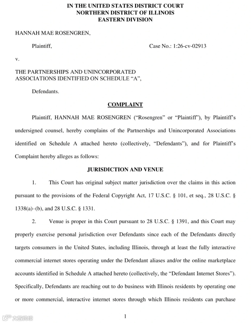 2026年3月16日,Hannah Mae Rosengren在美国伊利诺伊州北区联邦法院(Illinois Northern District Court)提起版权侵权诉讼,案号26-cv-02913。