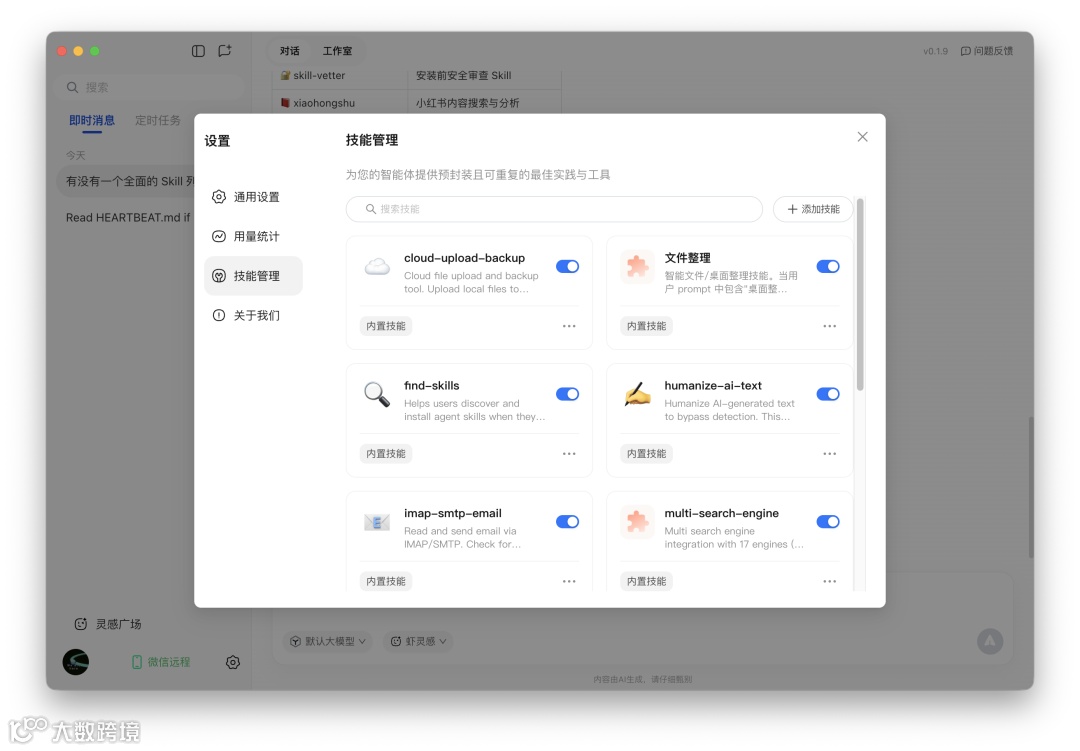 尽管提供「技能管理」入口供高级用户手动浏览或导入GitHub技能,但界面仍以“对话创建”为首要添加方式,凸显产品对极简交互的坚持。