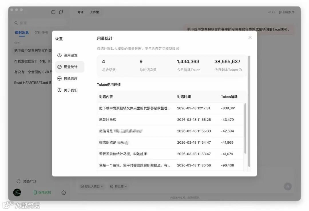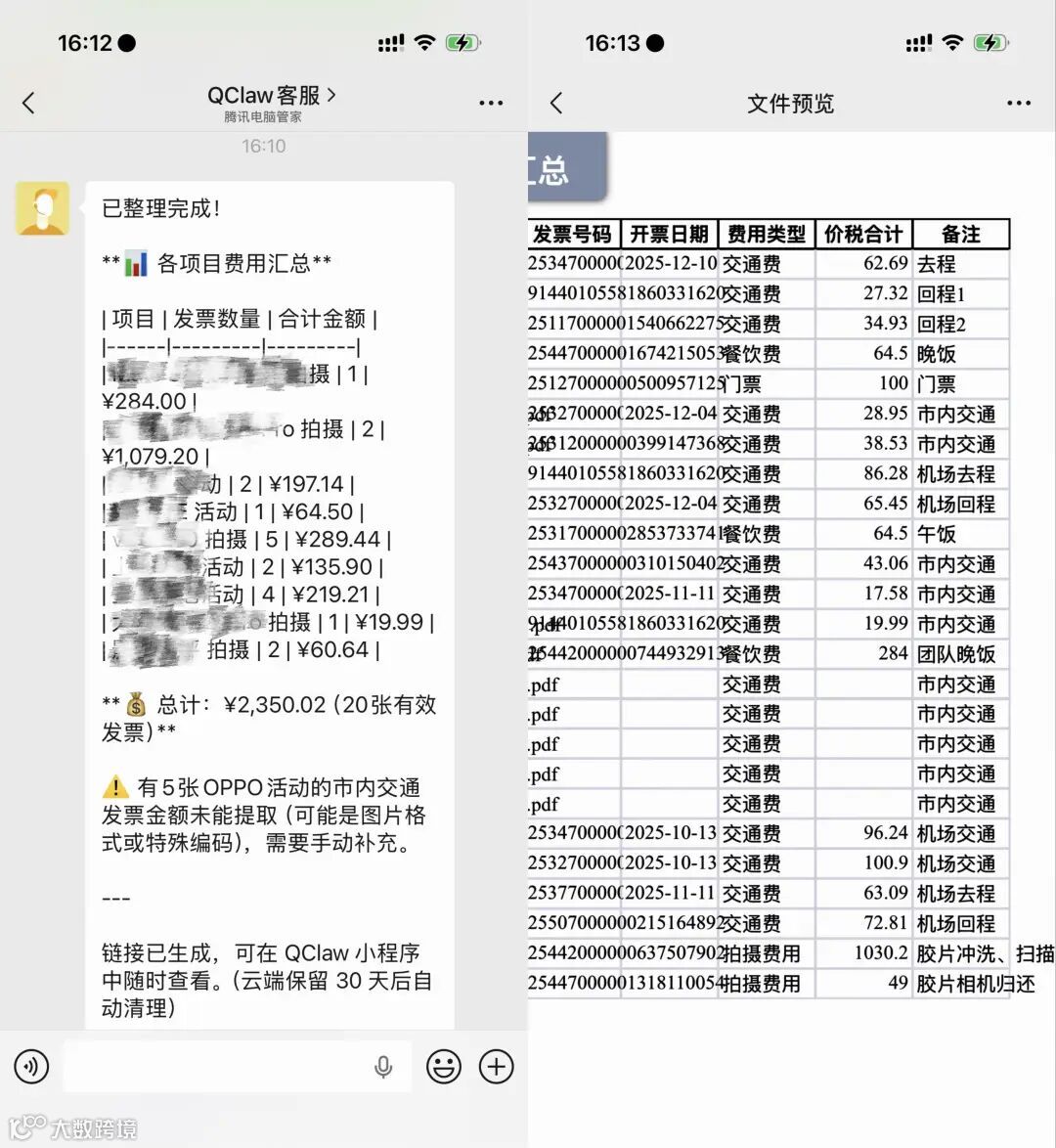 测试显示,QClaw对扫描件转PDF格式的发票识别准确率较低,但原生电子发票处理效果良好。整套流程消耗Token约83万(电脑端)至46万(微信远程),反映其在复杂任务中对算力资源的需求较高。