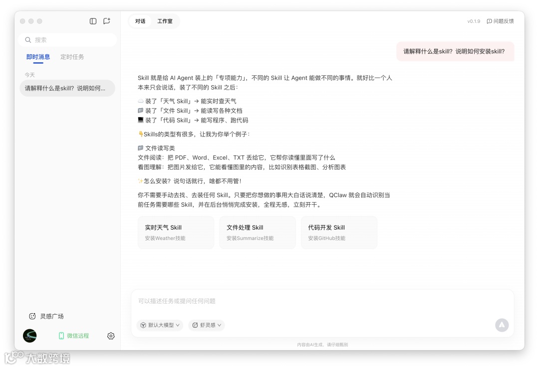 QClaw采用左侧聊天、右侧执行的双栏界面,主界面预设快捷入口,点击「安装你的第一个 Skill」即可引导新手完成首次技能配置。其Skill库依托ClawHub与GitHub,已收录超5000种功能模块。用户只需用自然语言描述需求(如“帮我整理发票”),系统将自动匹配并推荐适用Skill,大幅降低使用门槛。
