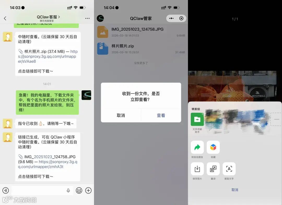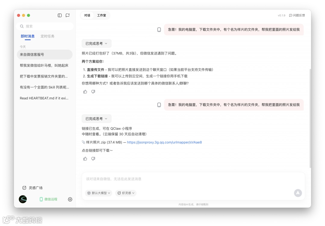 v0.1.9版本强化了文件传输能力:用户可通过QClaw小程序接收电脑端文件。实测中,单张图片传输成功率较高,且Exif信息完整保留;但多图传输时易出现部分消息未送达、压缩包无法解压、链接跳转仅限小程序等问题,需依赖电脑端下载链接方可获得原始文件。
