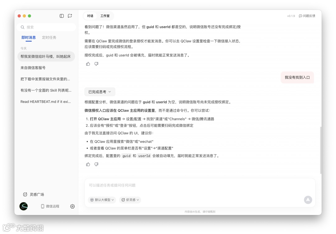QClaw虽已接入微信渠道,但在联系人识别方面存在明显短板。测试中多次出现无法定位好友、反复尝试后提示“guid与userId为空”等问题,即使重新绑定微信账号亦未能解决。相关配置入口在当前版本设置中不可见,实际可用性受限。