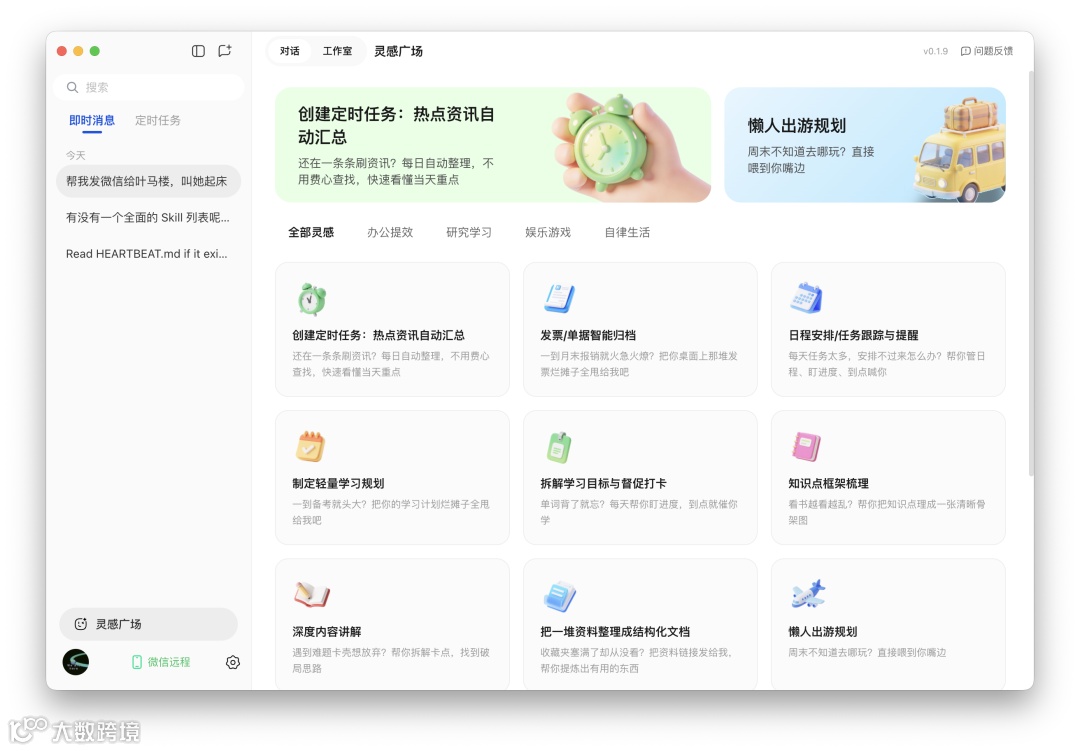 针对新手缺乏使用思路的问题,v0.1.9新增「灵感广场」,内置15类预设任务模板,涵盖办公提效、内容生成等高频场景。例如「发票/单据智能归档」功能可自动解析PDF发票并生成Excel报销明细表。