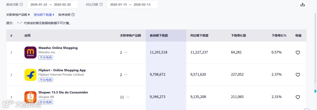 Insightrackr数据显示,2026年双节期间,头部电商应用下载量整体上升。在斋月重点市场,Meesho、Flipkart、Shopee均实现增长;Shopee以2.31%增幅领跑双节覆盖区域。