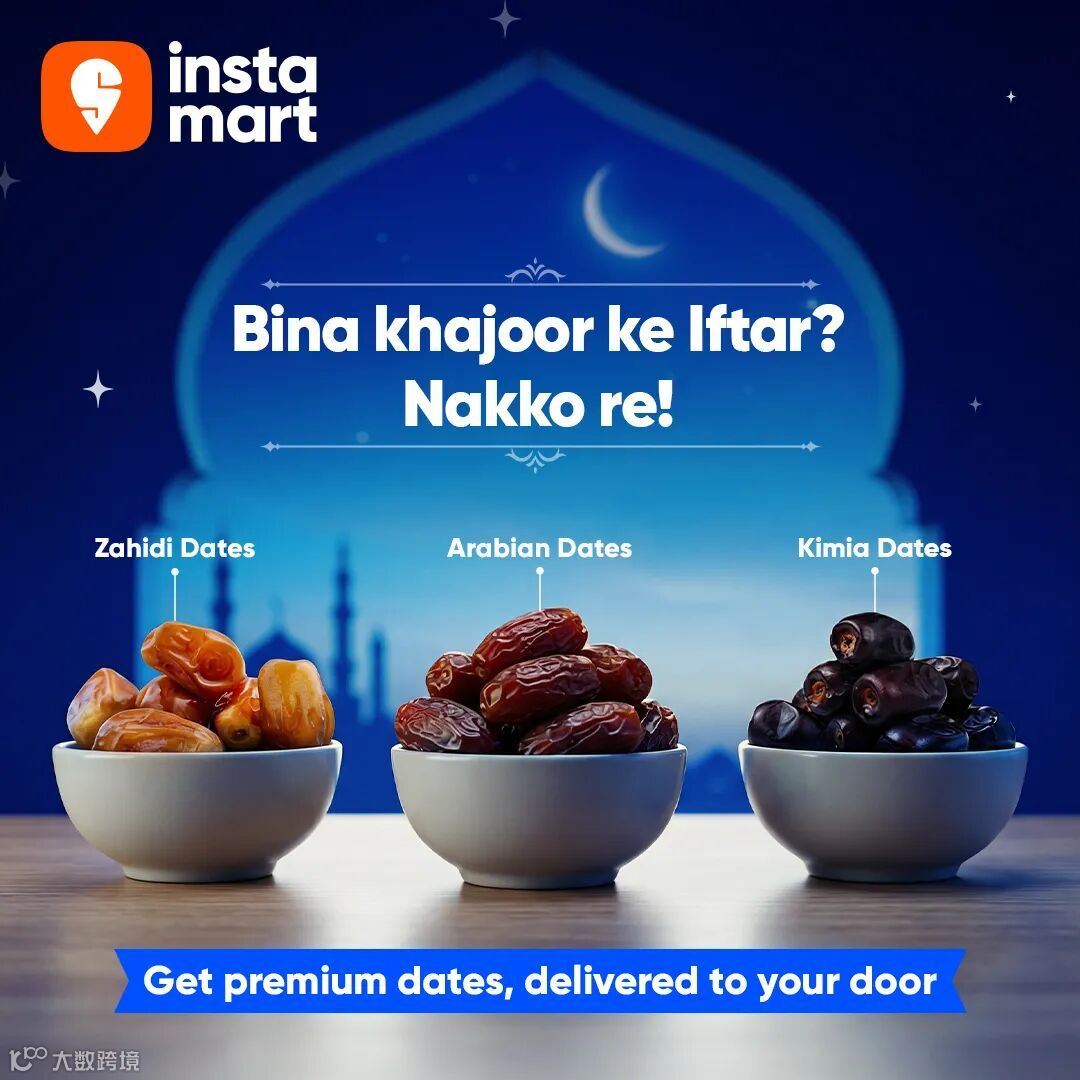 Instamart未简单借势节日,而是将即时配送能力深度嵌入斋月场景——围绕“开斋吃椰枣”习俗设计广告语,精准唤起用户节前备餐与开斋采购的即时需求,有效提升下载转化效率。