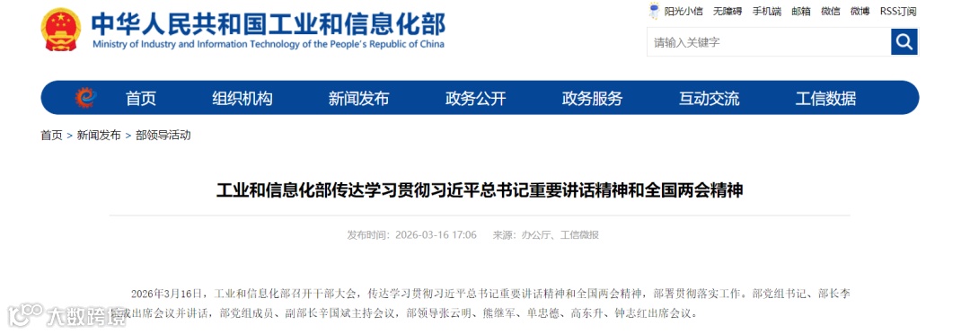 2026年3月16日,工业和信息化部召开干部大会,传达学习贯彻习近平总书记重要讲话精神和全国两会精神,部署贯彻落实工作。会议强调,要以钉钉子精神推动各项重点任务落地见效,确保“十五五”实现良好开局。