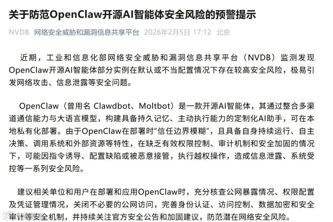 工信部网络安全威胁和漏洞信息共享平台(NVDB)亦发布警示:OpenClaw在默认或不当配置下,易引发网络攻击与信息泄露风险。