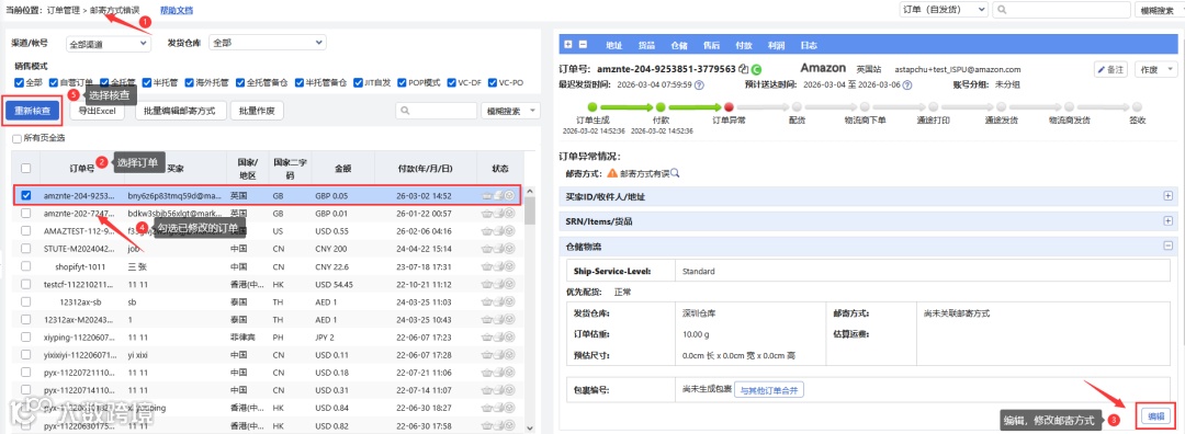 路径:订单管理 → 邮寄方式错误 → 选择订单 → 点击“仓储物流” → “编辑” → 下拉选择邮寄方式 → “重新核查”。