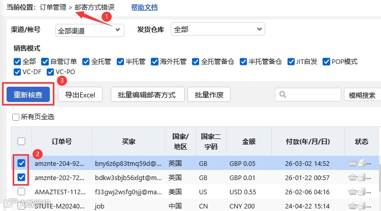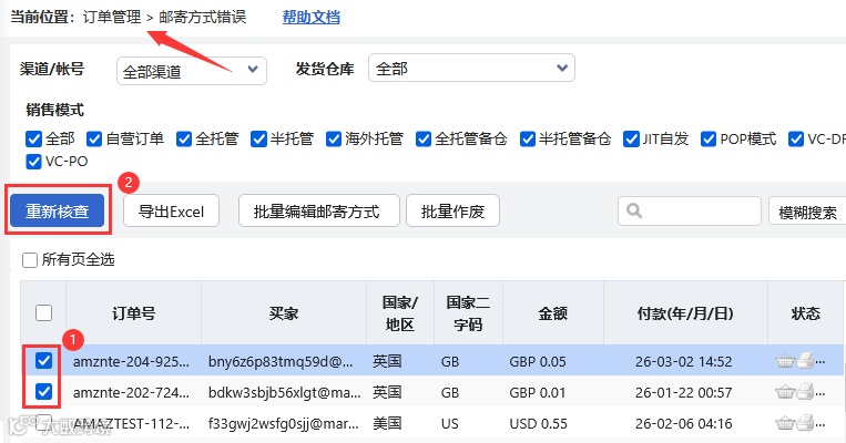 上述配置完成后,返回“邮寄方式错误”页面,勾选订单 → 点击“重新核查”。