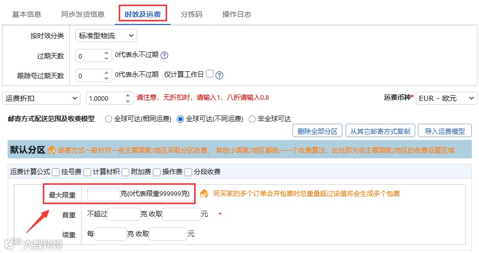 路径:基础设置 → 物流设置 → 编辑邮寄方式 → “时效及运费” → 修改最大限重值。