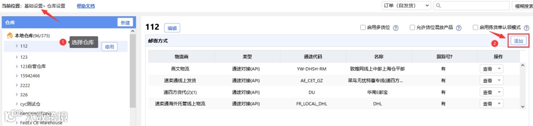 (b)路径:基础设置 → 仓库设置 → 在目标仓库下添加该邮寄方式。