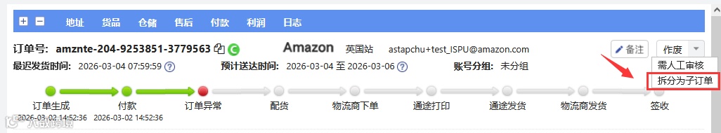 路径:订单管理 → 邮寄方式错误 → 点击订单 → 订单右上角下拉菜单 → 选择“拆分为子订单”。