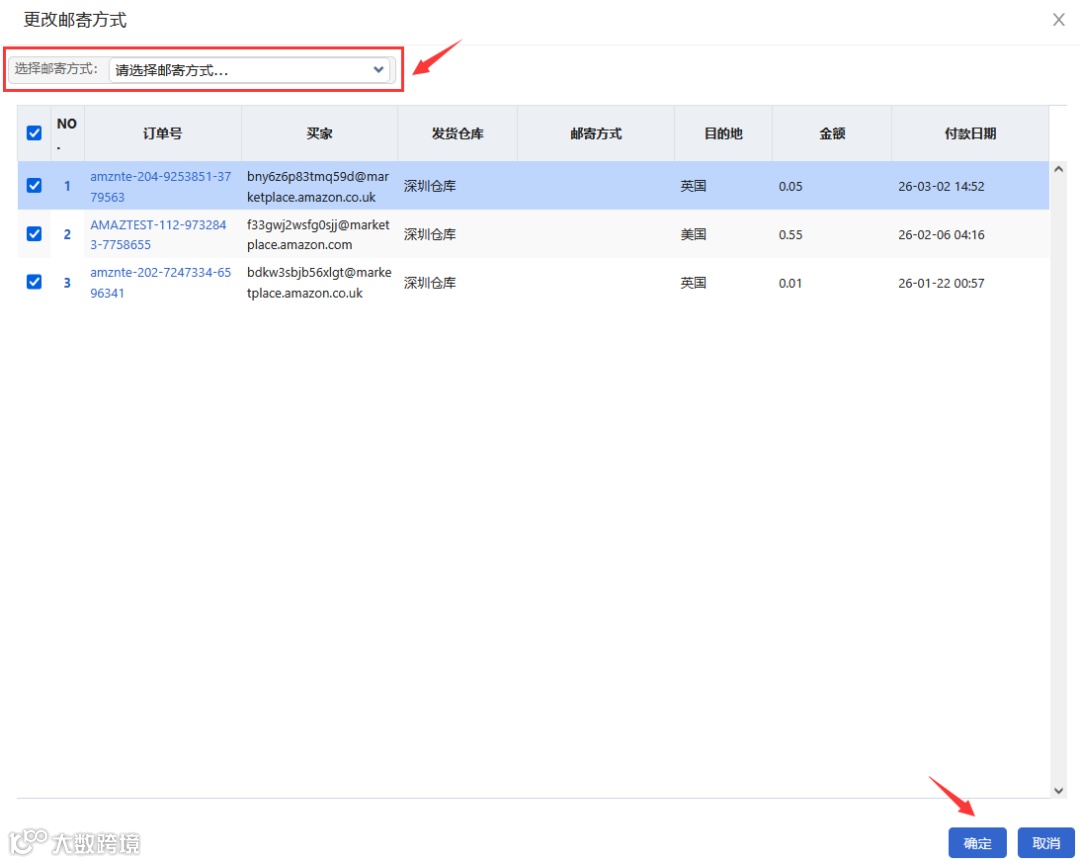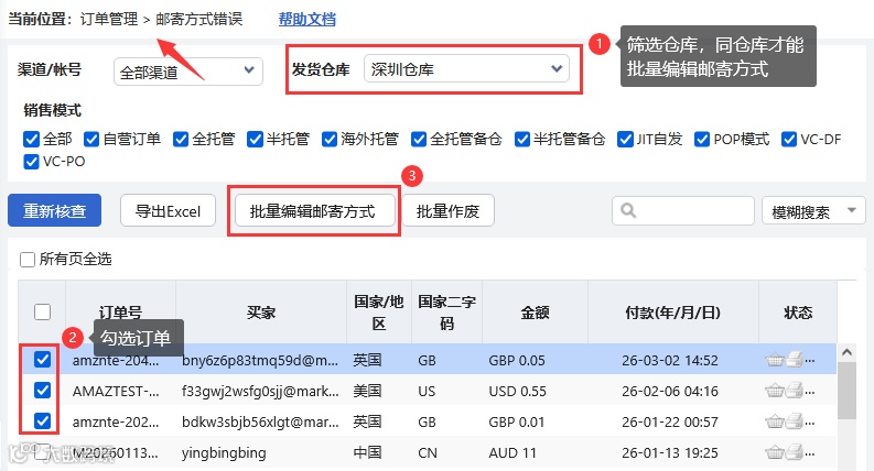 路径:订单管理 → 邮寄方式错误 → 按发货仓库筛选 → 勾选多单 → “批量编辑邮寄方式” → 选择邮寄方式 → “确定” → “重新核查”。