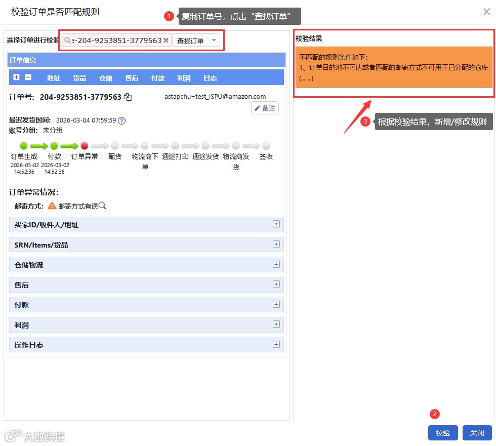 进入“订单管理 → 综合处理 → 邮寄方式错误”,点击订单右侧“操作日志”。若提示“匹配失败,请检查:1. 目的地是否可达;2. 是否可用于已分配仓库;3. 是否超重”,请依下列三项逐一核查: