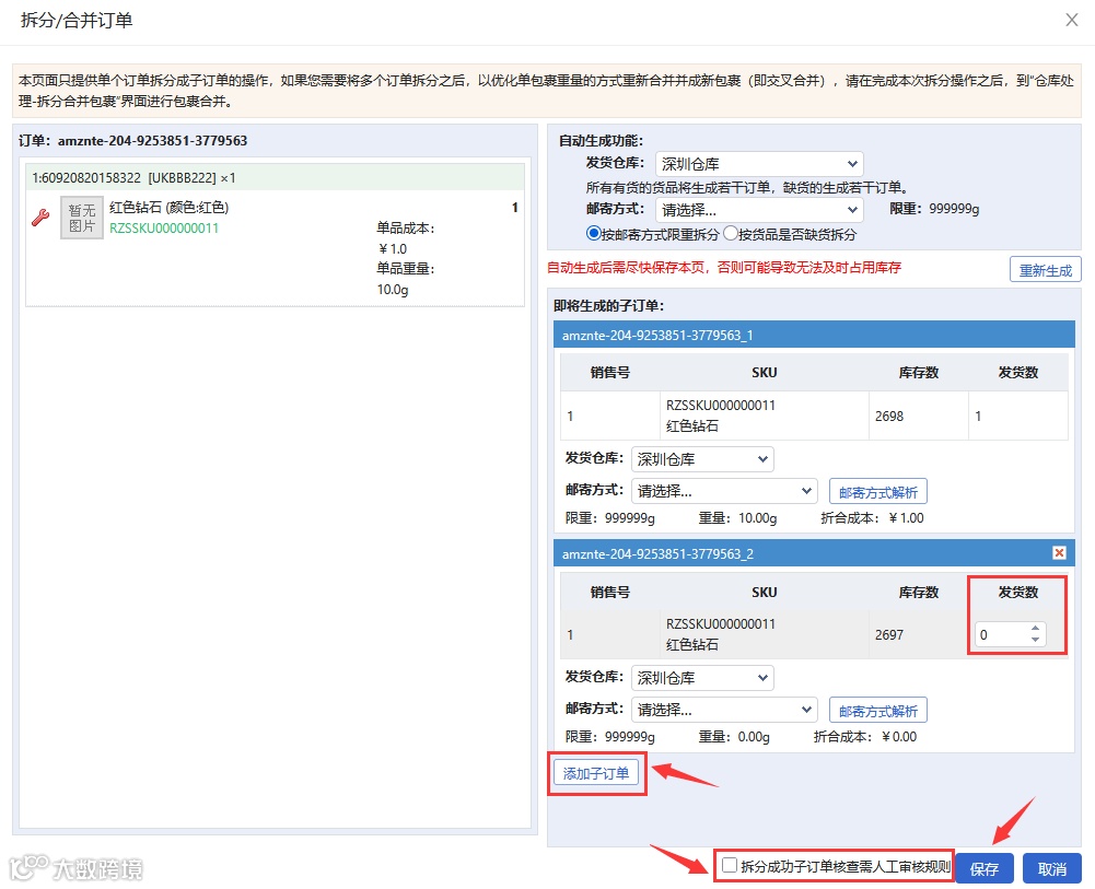 在拆分页面设置各子订单发货数量,如需更多子订单,点击右下方“添加子订单”;若需人工审核,勾选“拆分成功子订单核查需人工审核规则”,最后点击“保存”。