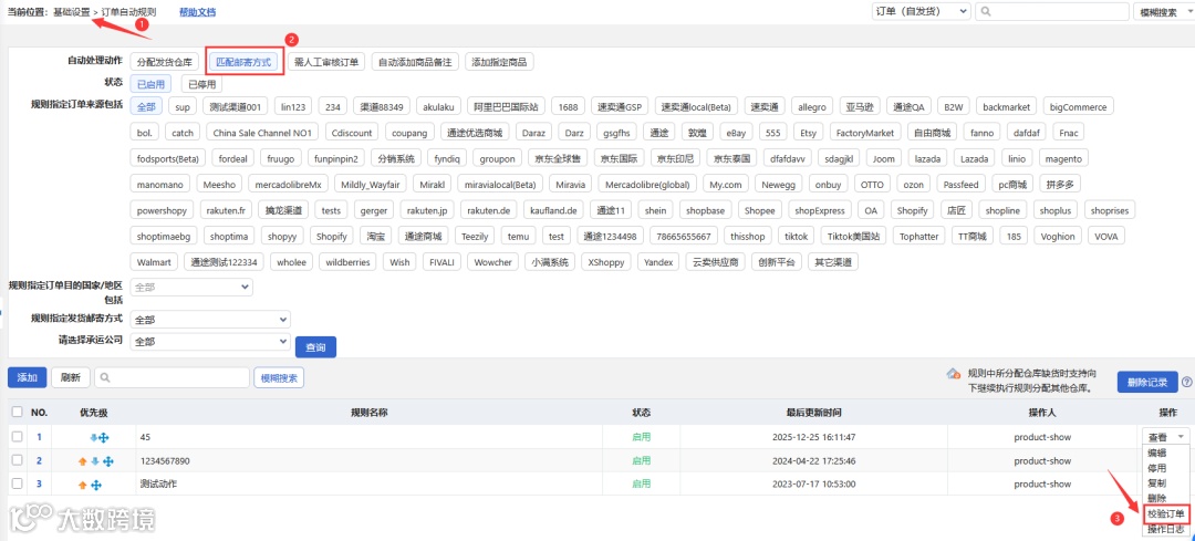 路径:基础设置 → 订单自动规则 → 选择“匹配邮寄方式”模块,检查或新建规则。