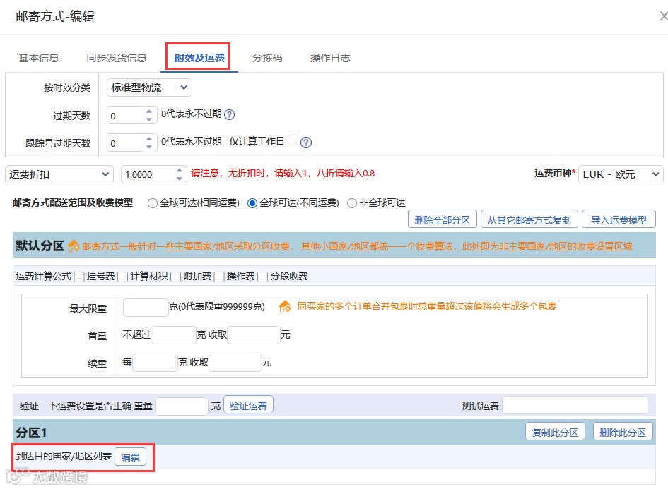 路径:基础设置 → 物流设置 → 编辑对应邮寄方式 → “时效及运费” → 设置可达目的地。