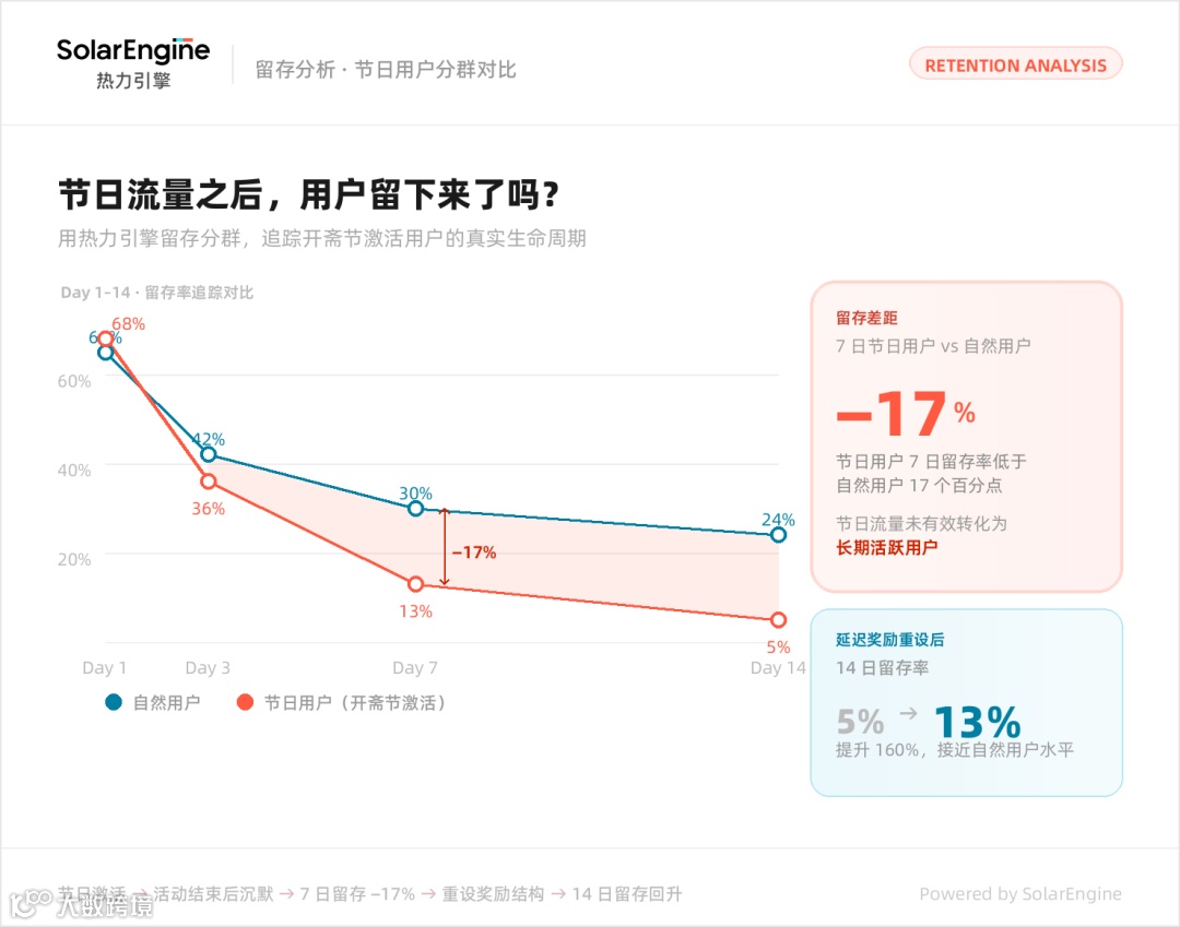 某消除类游戏连续两年复盘发现:“节日用户”7日留存率比自然用户低17%。深入分析后定位为:活动大量发放体力道具,用户3天内“玩爽即止”,活动结束、体力耗尽后缺乏回归理由。后续团队压缩即时奖励,增设“开斋节后第7天可领取”的延迟奖励,引导回访习惯——节日期间激活用户的14日留存率从5%提升至13%。