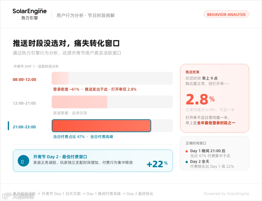 某策略类游戏曾于印尼时间上午9点推送礼包通知,触达量正常,但打开率仅2.8%(日常均值6%–8%)。热力引擎行为分析显示:前一年开斋节Day 1 上午8–12点登录密度较平时下降61%,而晚间21:00–23:00付费行为占全天总量的47%;且Day 2整体付费转化率比Day 1高出22%。