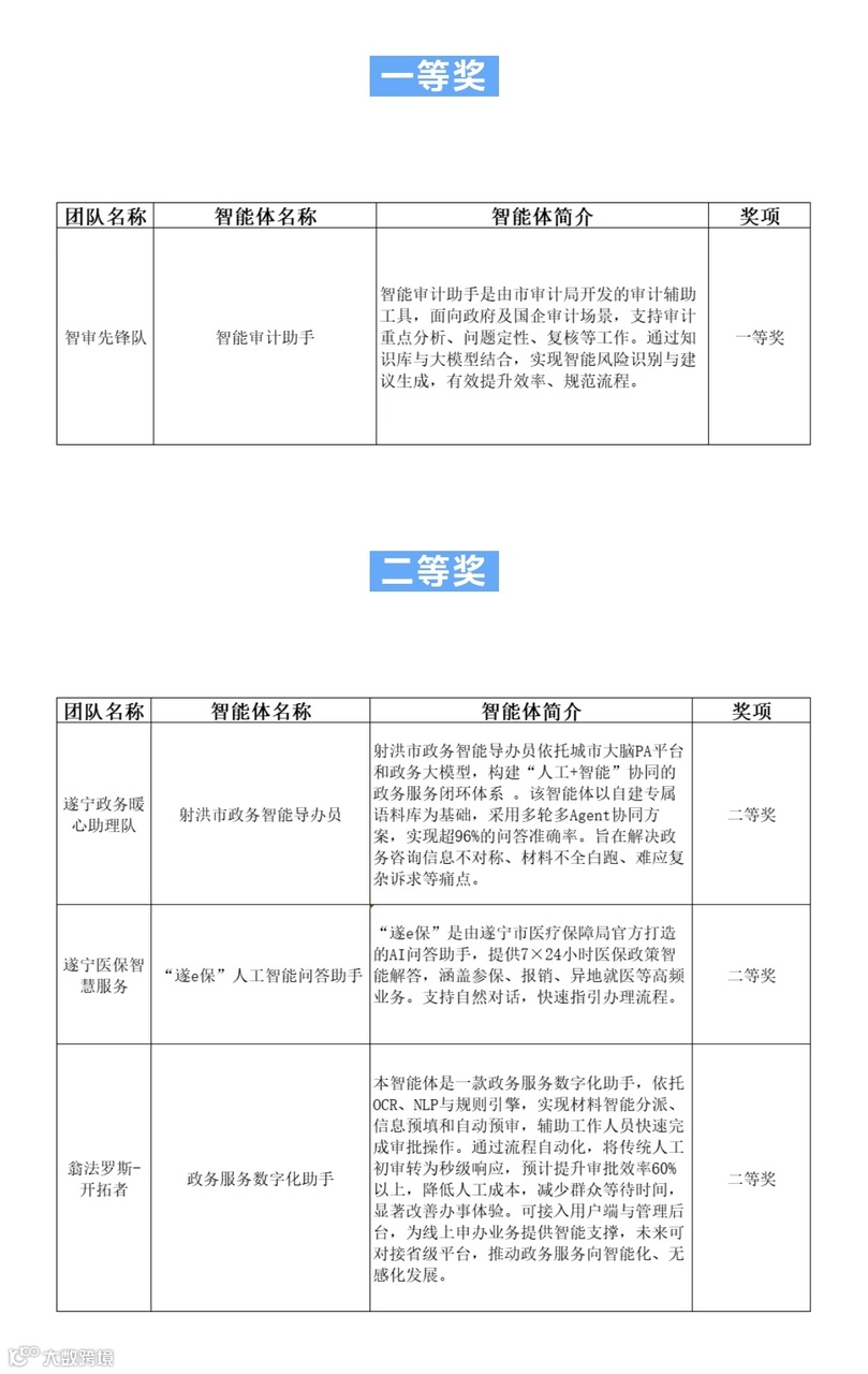 一等奖项目“智能审计助手”,聚焦审计工作法规庞杂、报表量大、经验依赖度高等痛点,上线后审计效率提升超80%;二等奖项目“射洪市政务智能导办员”,依托专属知识库与多轮对话技术,将政务问答准确率提升至96%以上,有效缓解信息不对称、材料反复补交、复杂诉求响应难等问题;其他获奖作品还包括“遂小申”投资项目申报智能助手、“遂e保”智能问答助手、“天眼智瞳”风险预警系统等。