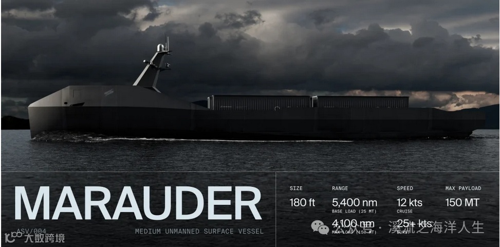 通过垂直整合、迭代设计与先进制造工艺,“掠夺者”号已升级至180英尺(约54.8米),大幅提升有效载荷与作业半径。升级后可容纳四个40英尺或八个20英尺标准集装箱,适配后勤保障、载荷运输与长期海上作业需求。该艇巡航速度12节、最高航速超25节、有效载荷150吨、航程达5400海里,支持自主运行或远程监控下的长期任务。