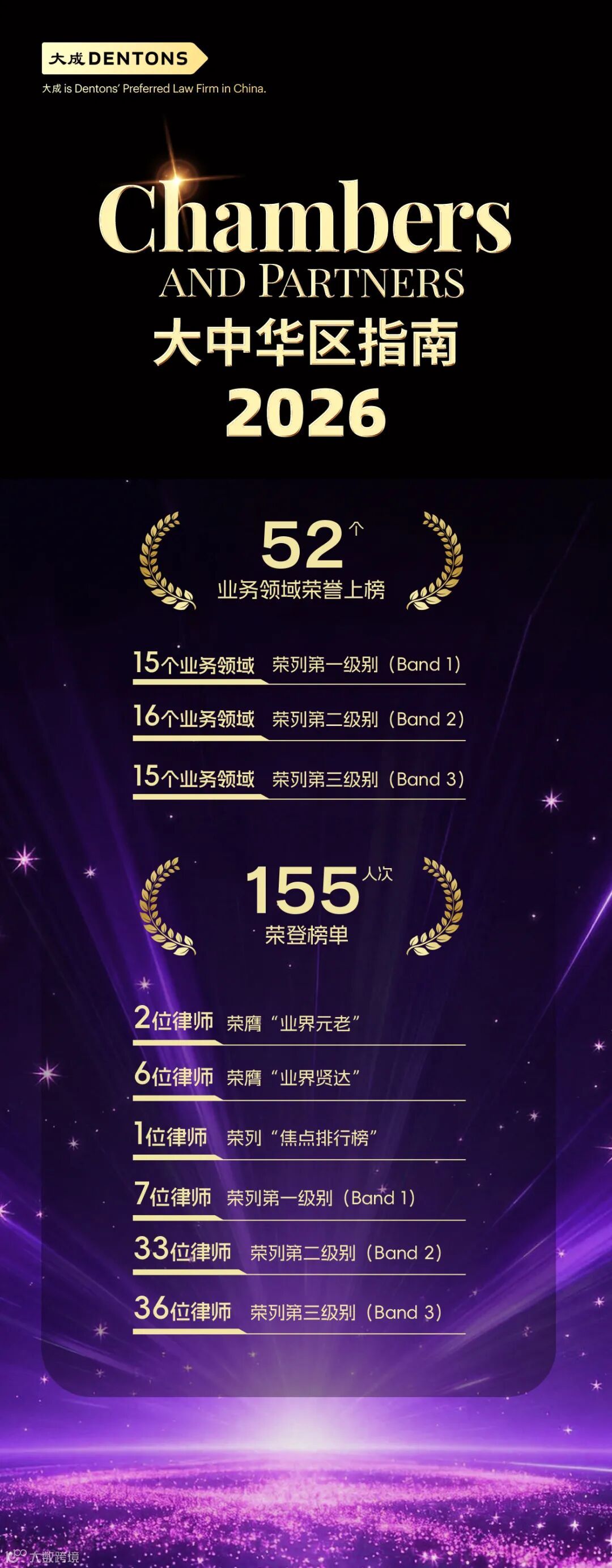 2026年1月15日,国际权威法律评级机构钱伯斯(Chambers and Partners)发布《钱伯斯大中华区指南2026》,大成律师事务所凭借突出的综合实力、区域竞争力与客户口碑,共有52个业务领域上榜,155人次(143位律师)获重点推荐。相较2025年度,上榜领域增加3个,新增20人次上榜。