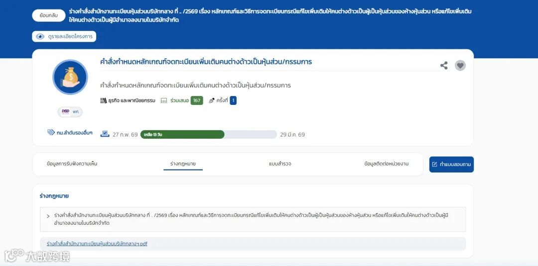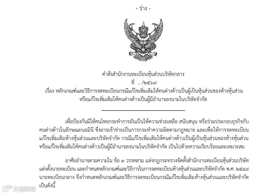 近日,泰国商业发展局(DBD)就《公司董事及合伙企业合伙人变更登记新规》草案公开征求意见,截止日期为2026年3月29日,拟于2026年4月1日正式实施。