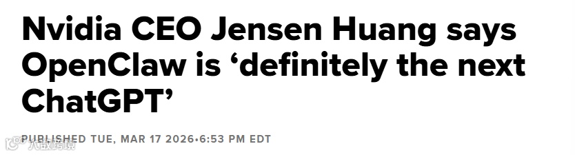 3月18日,据CNBC报道,英伟达CEO黄仁勋在GTC大会期间表示,OpenClaw的快速崛起标志着人类与人工智能互动方式的重要跃升,称其“绝对是下一个ChatGPT”。