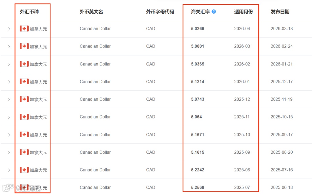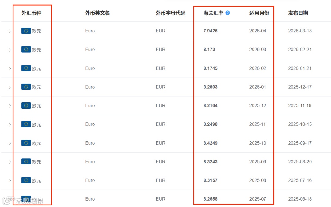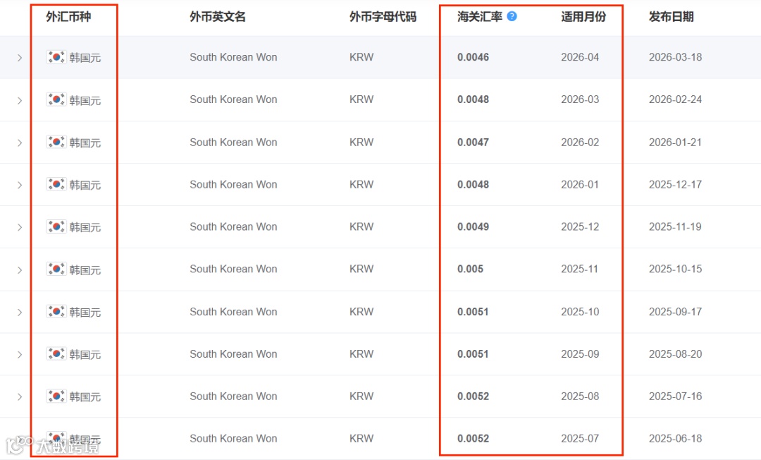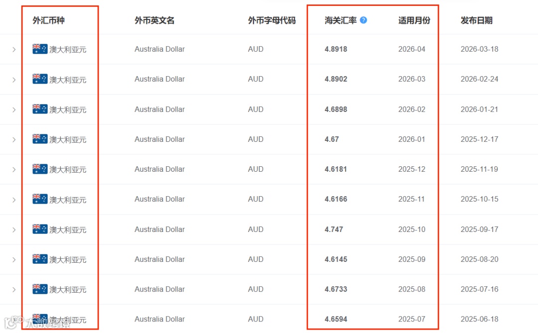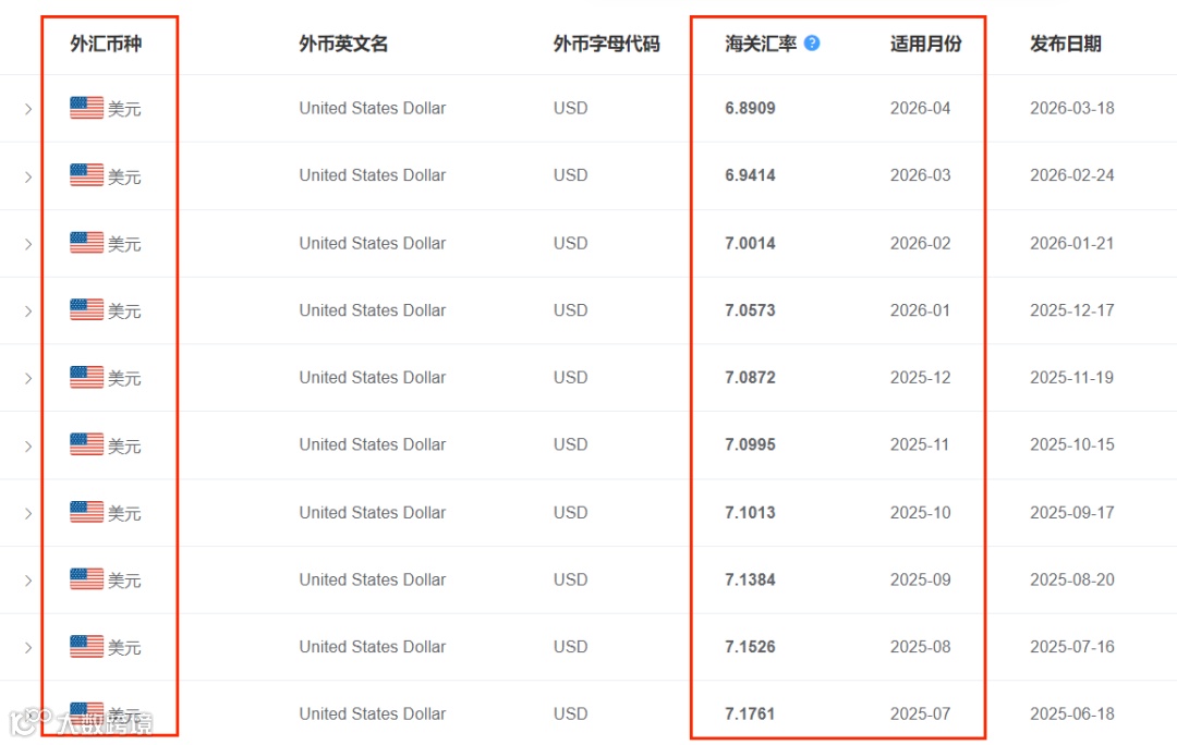 海关每月使用的计征汇率,为上月第三个星期三的基准汇率,涵盖美元、欧元、英镑、澳大利亚元、新西兰元、加拿大元、韩元和日元。