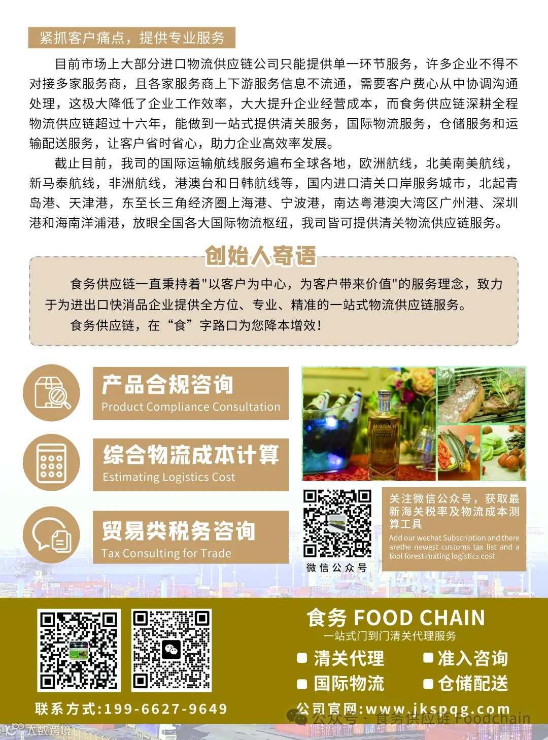 食务供应链由拥有17年进出口报关服务经验的企业创始人创立,旗下运营广东快消品供应链管理有限公司。公司专注进出口食品(含肉类、水产品、水果、化妆品、酒类等)门到门全链条服务,秉持“以客户为中心,为客户创造价值”理念,助力企业降本增效,保障快消品安全合规进入中国市场。