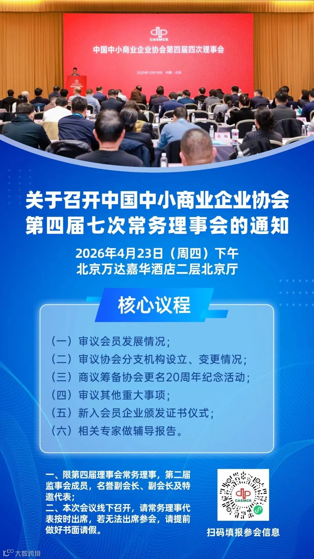 根据《中国中小商业企业协会章程》规定,经研究,定于2026年4月23日(星期四)下午在北京召开中国中小商业企业协会第四届七次常务理事会议。现将有关事项通知如下: