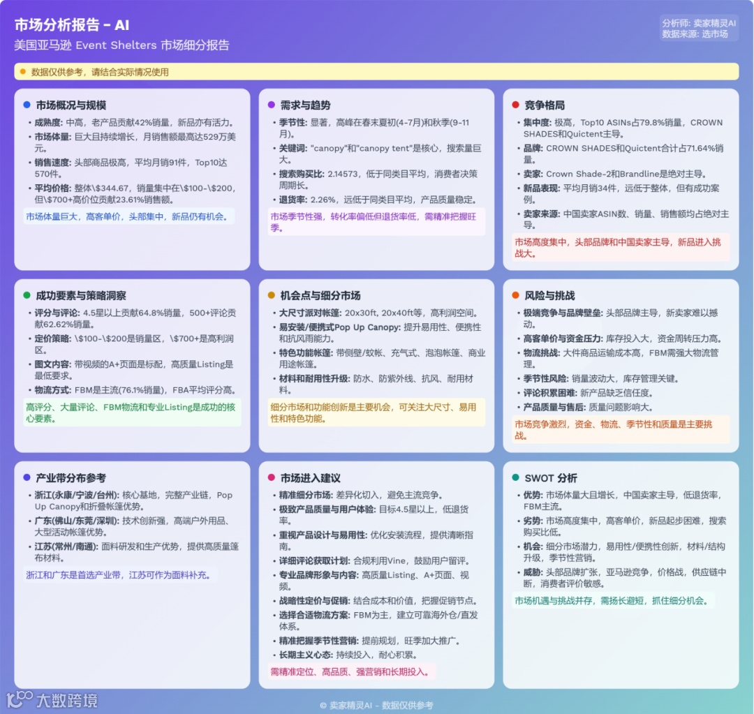 美国亚马逊Event Shelters(活动庇护所)市场体量巨大、季节性显著、品牌与头部卖家高度集中,CROWN SHADES、Quictent等占据销量与销售额主导地位,价格跨度大。